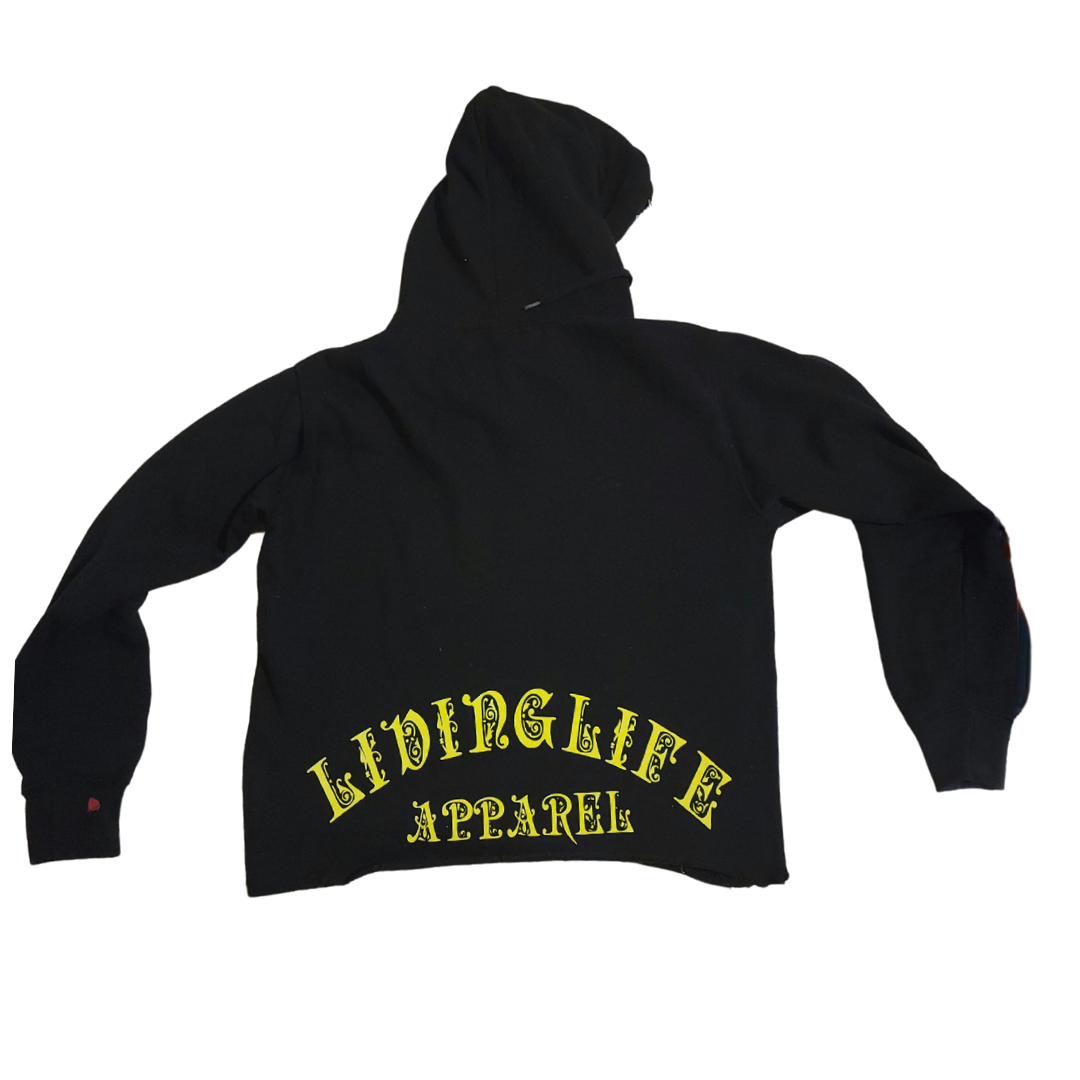 When the CEO created this hoodie, she was thinking of who she used to be and who she’d become. Each color she used wasn’t because it look good together but it represented & helped define the trials and tribulations of growth. The green representing new beginnings & abundance, the blue for loyalty, the yellow for opportunity, the pink for love, the orange for independence, the purple for spirituality & imagination, the red for courage & energy & the white for simplicity. She put this on a black hoodie because the color black represents mystery, power & protection. Every human being is a mystery that desires power & deserves protection. The safety pins in the hood symbolizes every mistake while chasing her dreams & having to stitch things up but keep moving forward while learning from those mistakes.